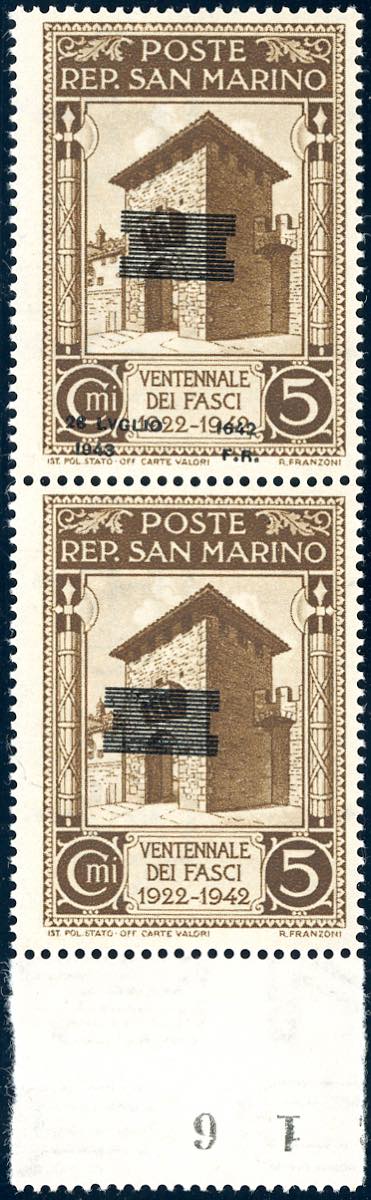 1943 - 5 cent. Caduta del fascismo, soprastampa di tipo diverso, coppia verticale, un esemplare con soprastampa fortemente spostata in ... Read more