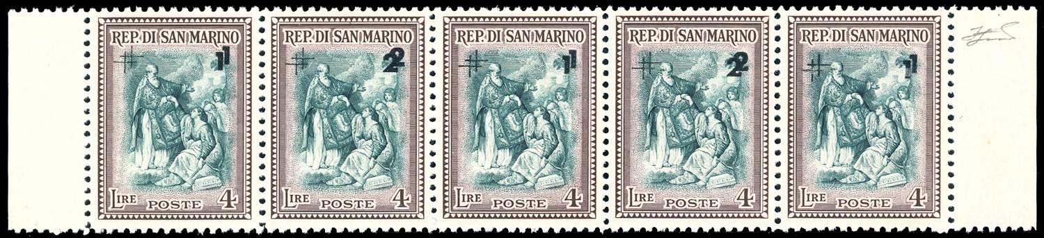 1947 1 + 4 lire e 2 + 4 lire Alberoniana soprastampati, striscia orizzontale di cinque, tutti con doppia soprastampa (328b/329b), bordo di ... Read more