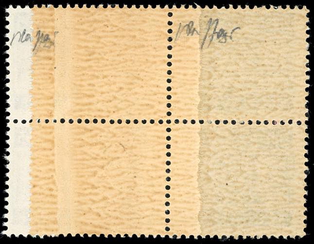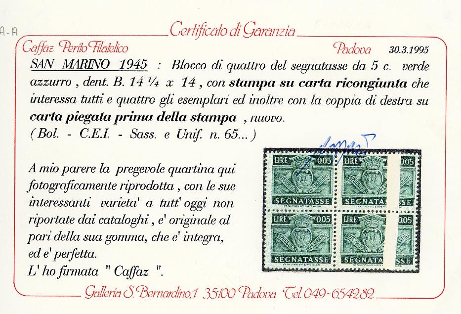 1945 - 5 cent. Stemma, blocco di quattro, tutti gli esemplari stampati su carta ricongiunta (65d), i due di destra con evidente pli ... Read more