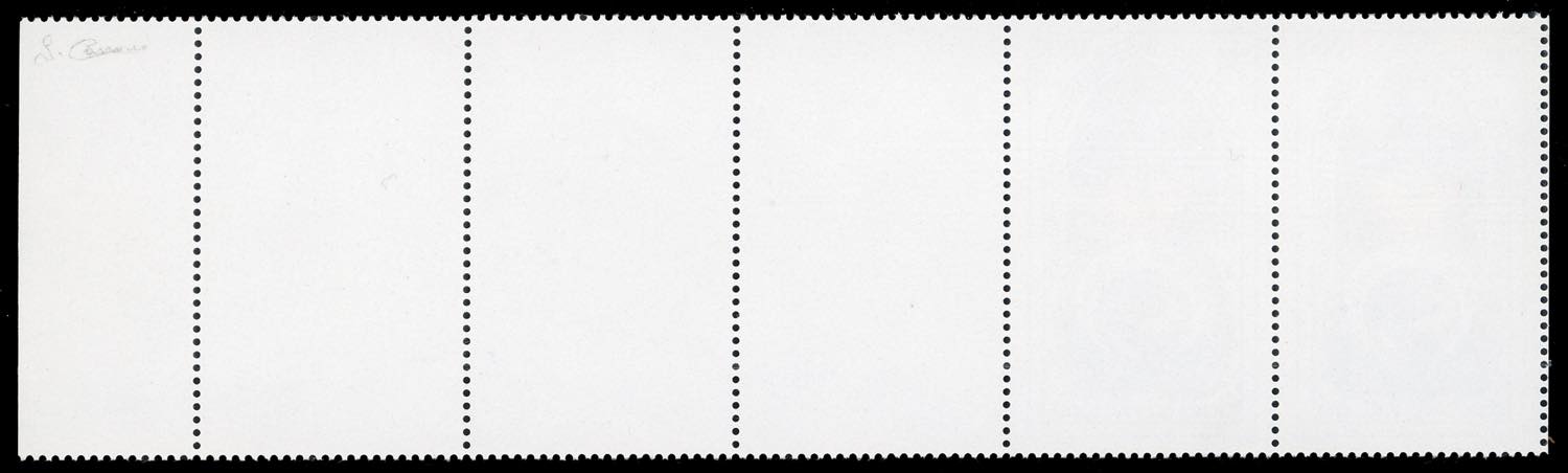 1997 - 1.000 lire Congresso Eucaristico, striscia orizzontale di cinque, gli ultimi tre esemplari senza la stampa del francobollo (1086a), ... Read more