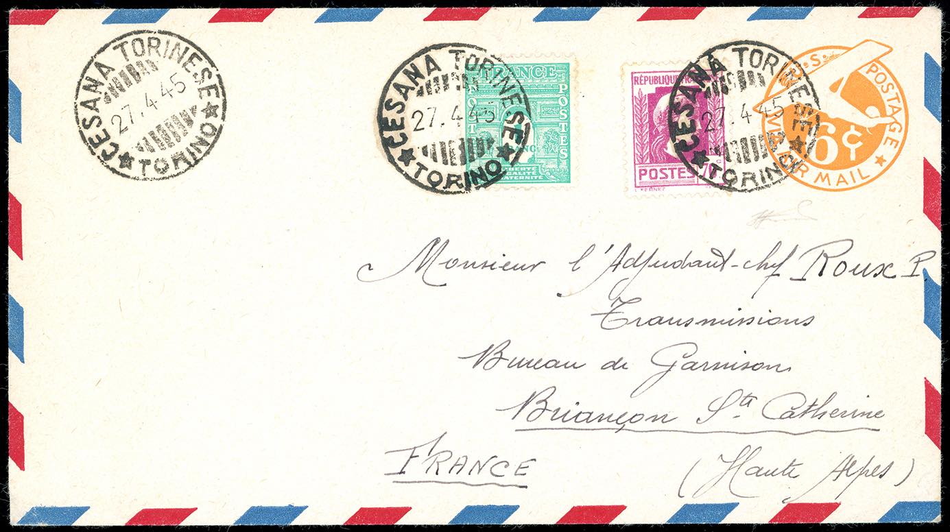 FRANCIA 1945 - 70 cent. e 1 franco (624,635), perfetti, ad integrazione di un aerogramma americano da 6 cent. annullati a Cesana Torinese ... Read more