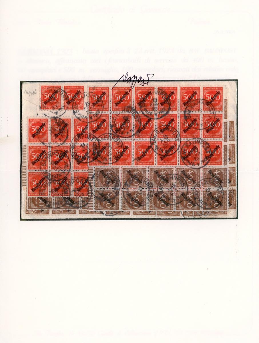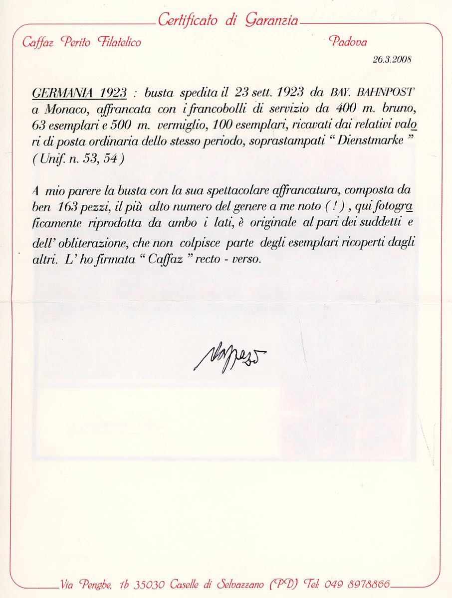 GERMANIA REICH 1928 - Eccezionale busta affrancata recto/verso con 63 esemplari del 40 m e 100 del 500 m soprastampati (53/54), da Bay. Bahnpost 13/9/1928 a Monaco. Spettacolare e unica! Dal certificato Caffaz "…spettacolare affrancatura di 163 esemplari, il più alto numero del genere a me noto…".