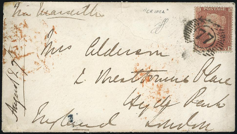 GRAN BRETAGNA 1855 - 1 p. Regina Vittoria (8), perfetto, su busta dalla Crimea a Londra 27/8/1855, via Marsiglia. Interessante ... Read more