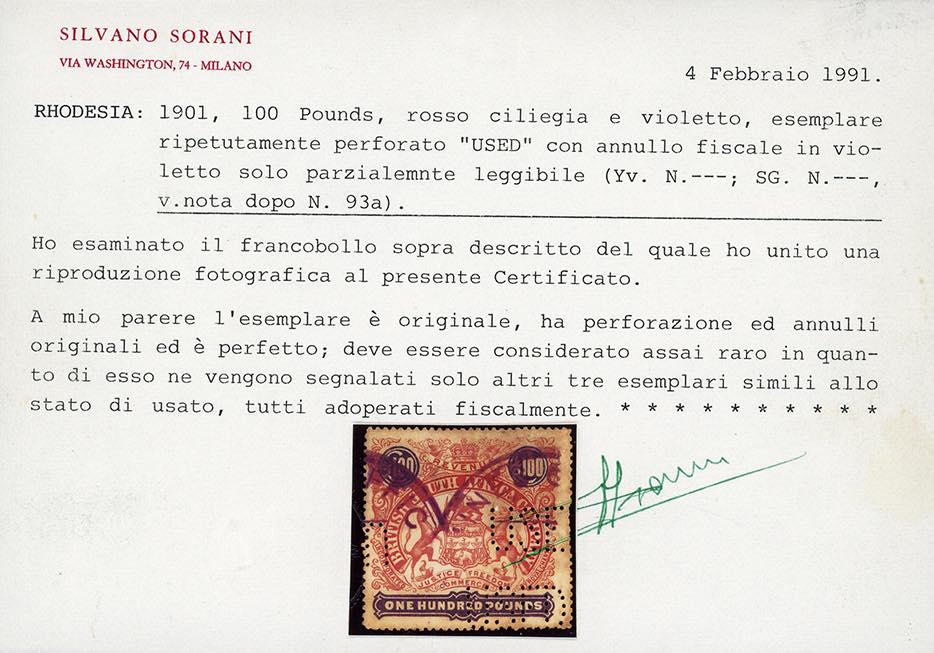 RHODESIA 1901 - 100 pounds (SG. 93a, vedi nota), perfetto, usato con annullo fiscale e perforato USED. Solo tre esemplari noti, tutti in questo stato. Rarità. Cert. Sorani e Raybaudi Oro.