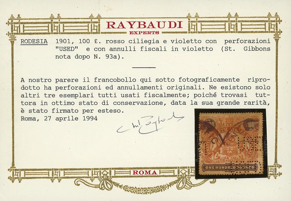 RHODESIA 1901 - 100 pounds (SG. 93a, vedi nota), perfetto, usato con annullo fiscale e perforato USED. Solo tre esemplari noti, tutti in ... Read more
