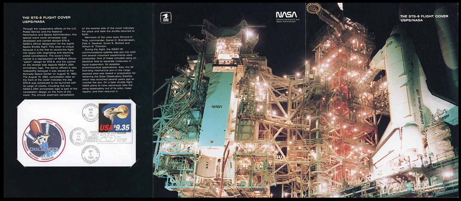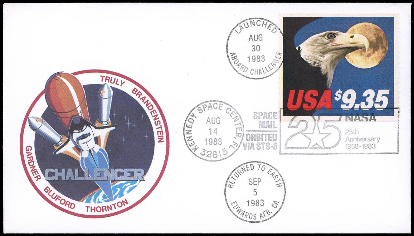 STATI UNITI SPAZIO 1983 - Lettera speciale con primo trasporto ufficiale nel cosmo con la navicella Challenger, affrancata con 9,35 dollari. Annulli del Kennedy Space Center, "Aboard Challenger 30/8/1983" e ritorno alla base di Edwards 5/9/1983. Molto bella e corredata di folder speciale.