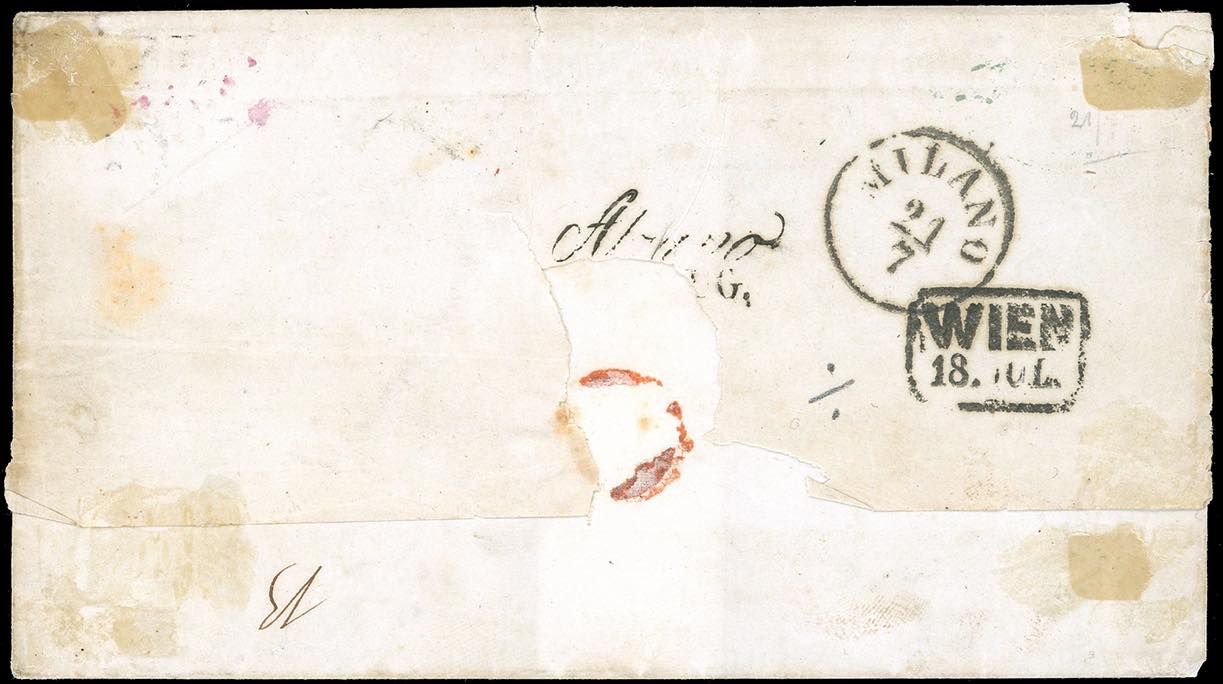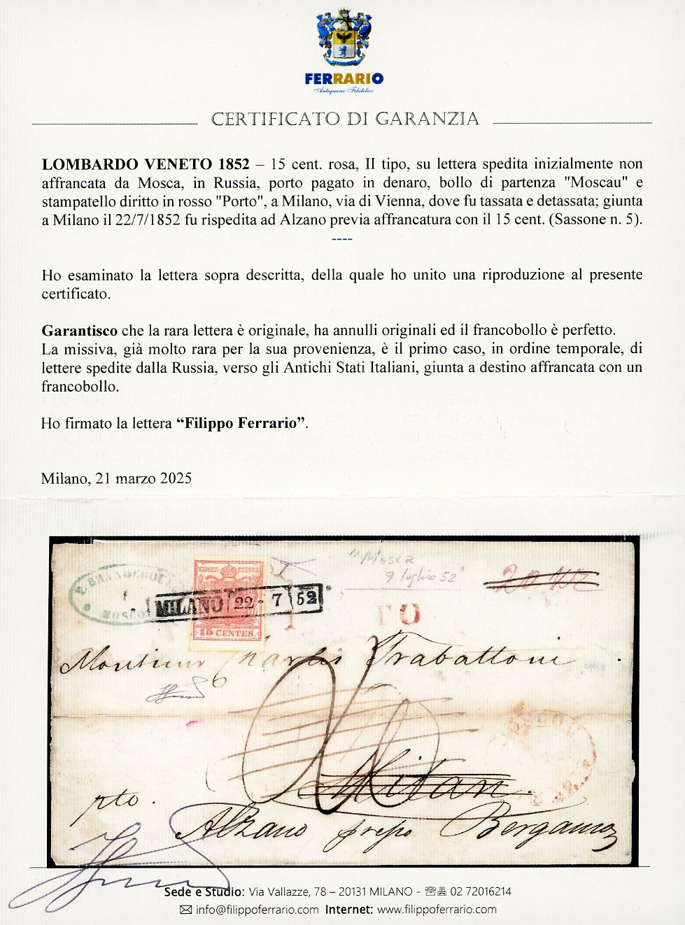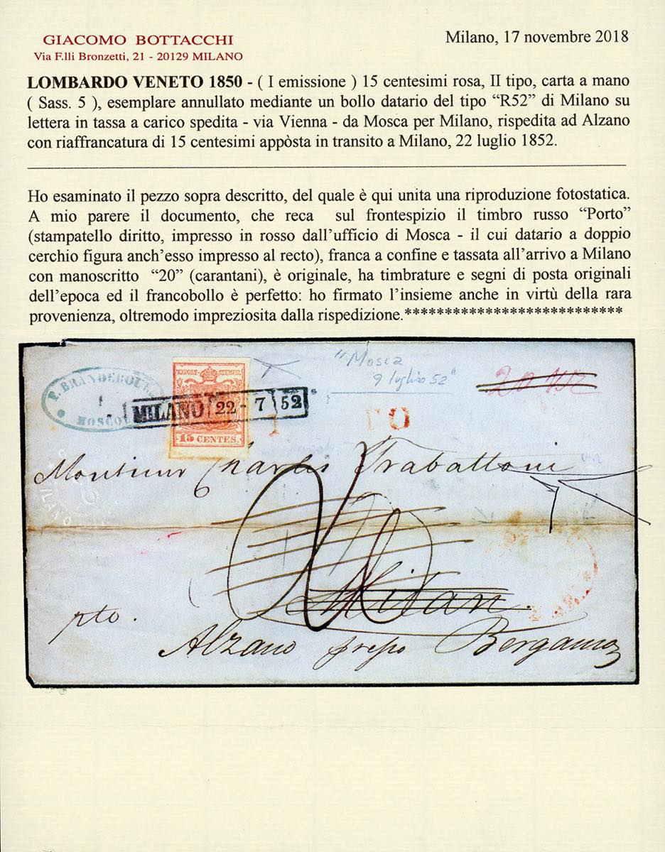 1852 - Lettera spedita da Mosca, in Russia, in porto pagato in denaro, bollo di partenza "Moscau" e stampatello diritto in rosso "Porto", a Milano, via di Vienna, dove fu tassata e detassata. Giunta a Milano il 22/7/1852 fu rispedita ad Alzano previa affrancatura con 15 cent. rosa, II tipo (5), perfetto. La missiva già molto rara per la sua provenienza, è il primo caso, in ordine temporale, di lettere spedite dalla Russia, verso gli Antichi Stati Italiani, giunta a destino affrancata con un francobollo. Per grande collezione specializzata. Cert. Bottacchi e Ferrario.