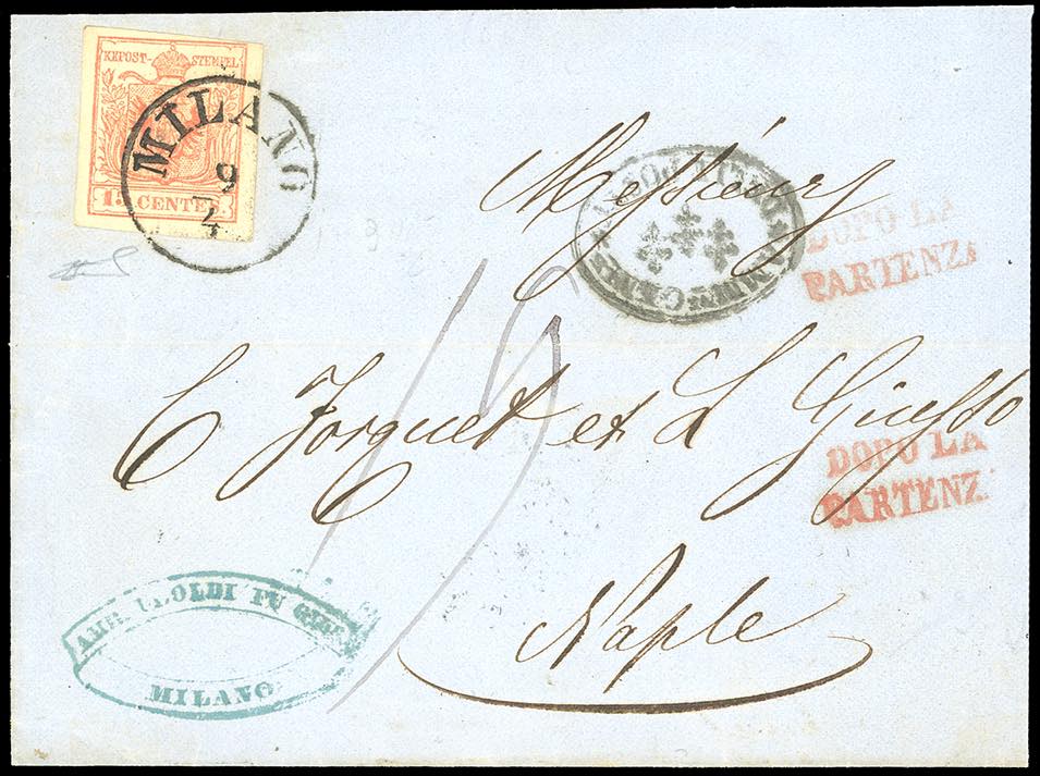 1857 - 15 cent. rosso vermiglio, carta a macchina (20), perfetto, su fresca lettera da Milano 9/4/1857 a Napoli, tassata 19 grana, al verso bollo di transito per lo Stato Pontificio. Non comune. Ferrario.