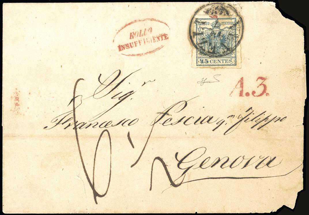 1857 - 45 cent. carta a macchina (22), perfetto, su sovracoperta di lettera da Venezia 12/7/1857 a Genova, "bollo insufficiente", "A.3" e ... Read more