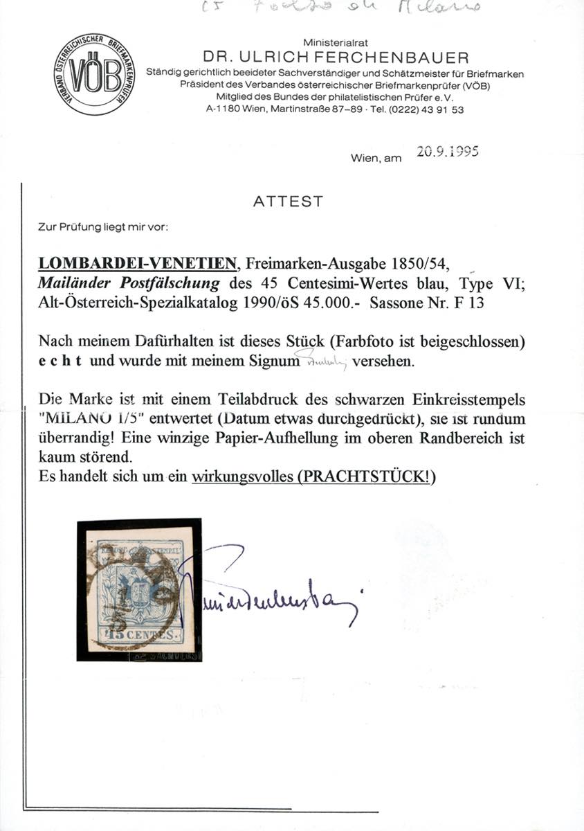 FALSI PER POSTA 1857 - 45 cent. azzurro, falso per posta di Milano, VI tipo (F13), perfetto e con grandi marigini, usato a Milano 1/5. Splendido! Cert. Ferchenbauer.
