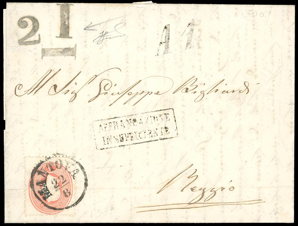 1862 - 5 soldi rosso (33), piega orizzontale d'archivio, su fresca lettera da Mantova 22/8/1862 a Reggio, bolli A1 e "affrancazione insufficiente" in cartella, con bolli di tassa "2,1,1" ripetuti accostati. Curiosa, da studiare. Ferrario.
