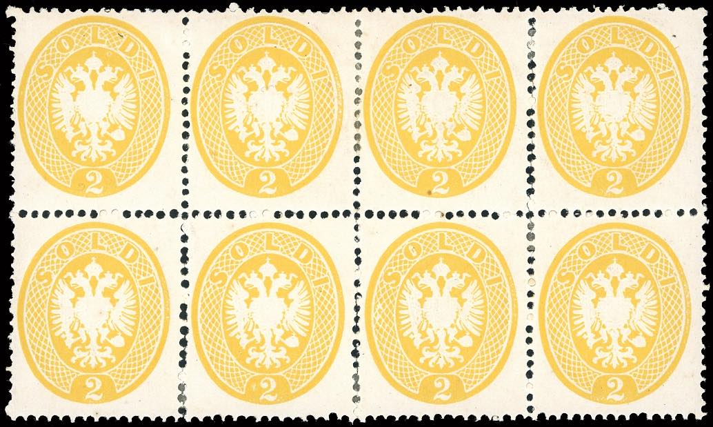 Lot 70 - 1863 - 2 soldi giallo, dent. 14 (36), blocco di otto ...