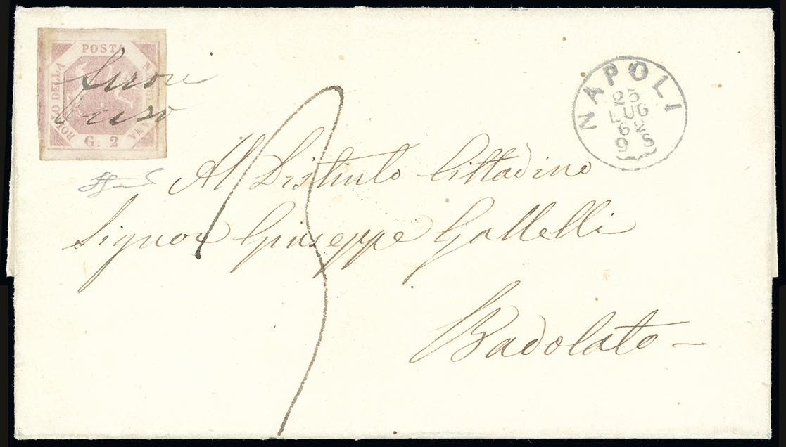1862 - 2 grana rosa brunastro, III tavola (7), perfetto e ben marginato, su fresca lettera da Napoli 25/7/1862 a Badolato. Il francobollo, usato diversi mesi dopo la fine della propria validità postale, venne annullato con la dicitura manoscritta "fuori uso" e la lettera venne tassata 3. Molto rara e di ottima qualità. Cert. Ferrario.
