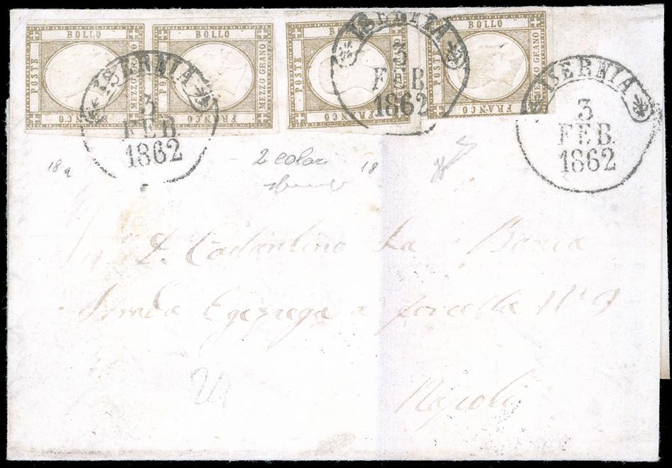 1862 - 1/2 grano bistro bruno, due esemplari, 1/2 grano grigio bruno, coppia verticale (18,18a), alcuni difetti, su fresca lettera da Isernia 3/2/1862 a Napoli. Rara combinazione di valori gemelli, di buon aspetto. Cert. Ferrario. Ex coll. Imperato.