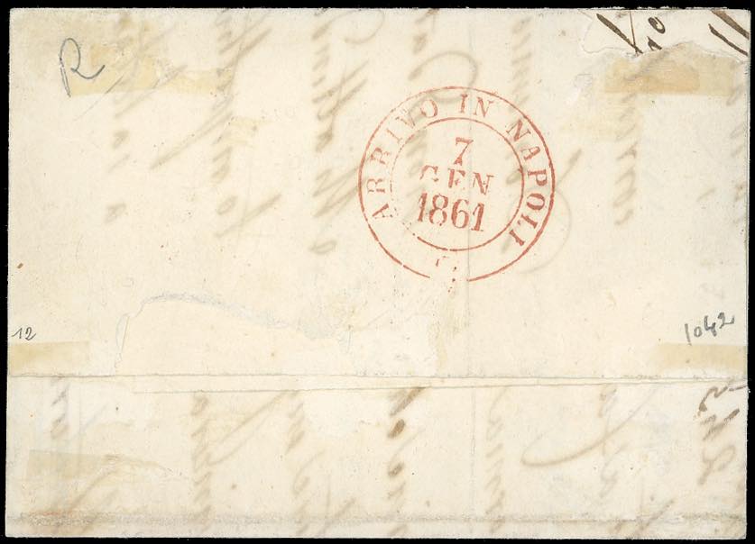 BISCEGLIE, svolazzo + cerchio rosso con datario capovolto punti 12 - 2 grana (6), perfetto, su lettera del 5/1/1861 per Napoli. Bella e ... Read more