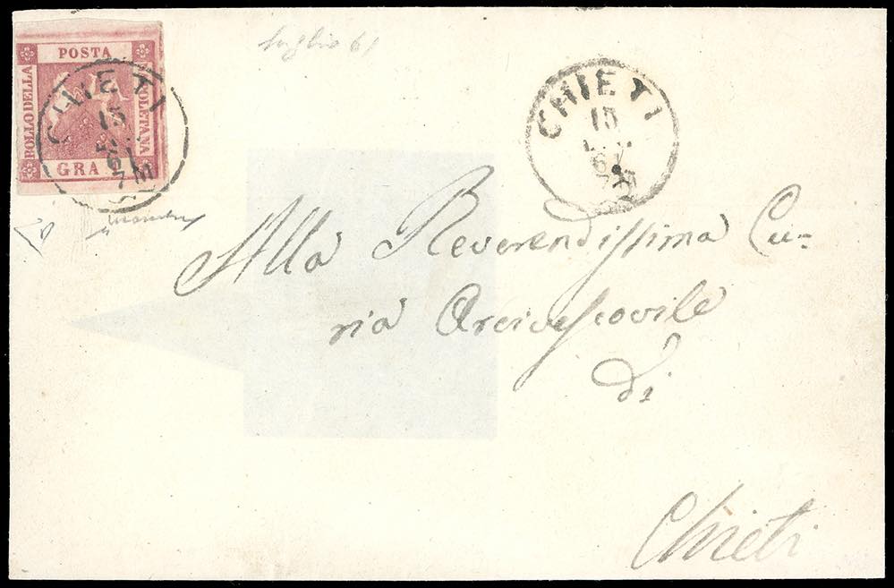 CHIETI, cerchio piccolo punti 12 - 1 grano (4a), lieve difetto a sinistra, isolato su fresca lettera del 13/7/1861 per città. Chiavarello, cert. E.Diena.