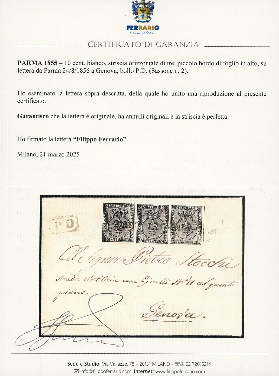 1856 - 10 cent. bianco (2), striscia orizzontale di tre, piccolo bordo di foglio in alto, perfetta, su lettera da Parma 24/8/1856 a Genova. ... Read more