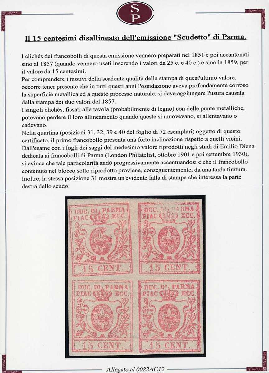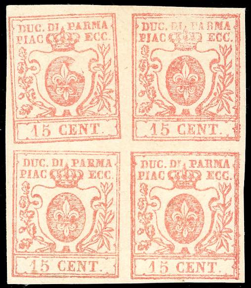 1859 - 15 cent. vermiglio (9), blocco di quattro pos. 31-32 e 39-40, il primo esemplare con forte disallineamento, nuovo, gomma originale, perfetto. Interessante e di ottima qualità. A.Diena, cert. SPC.