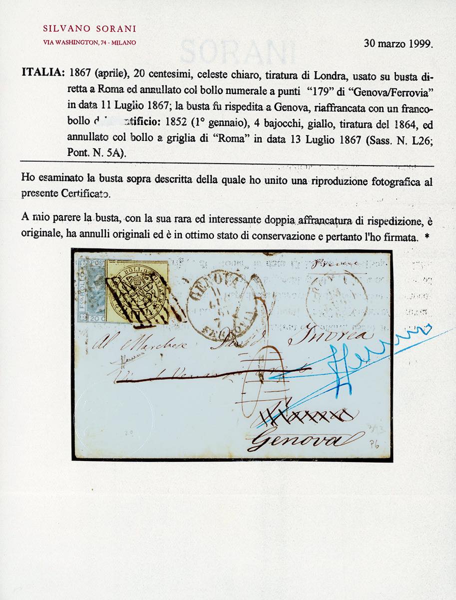 1867 - 20 cent. celeste chiaro, tiratura di Londra (Regno L26), su busta da Genova 11/7/1867 a Roma, dove fu riaffrancata con 4 baj giallo (5A) in data 13/7/1867 prima di essere rispedita a Genova, sul fronte segno di tassa pontificia e cassata e bollo a tampone di tassa italiana. Interessante affrancatura "mista" di rispedizione. Cert. Sorani.