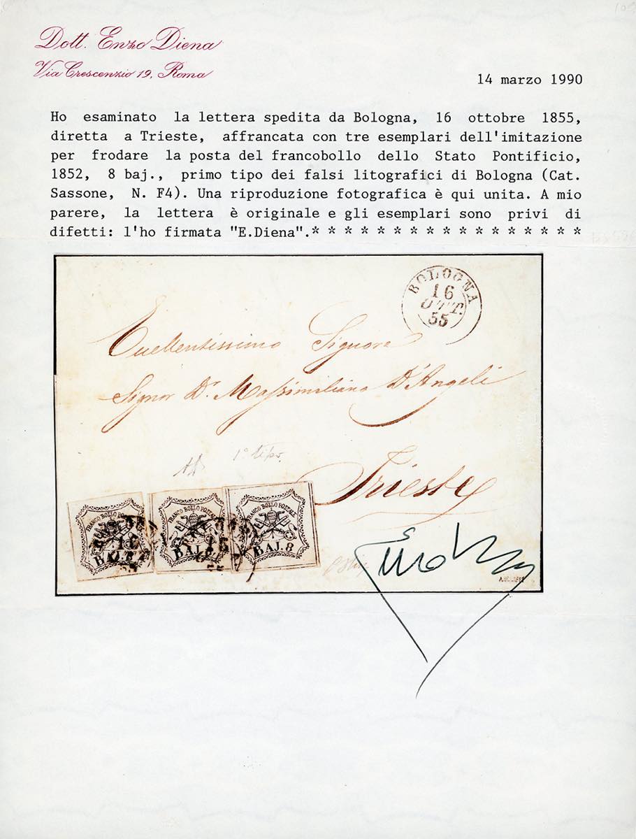 1855 - 8 baj bianco, falso per posta, I tipo (F4), tre esemplari, privi di difetti, su lettera di triplo porto da Bologna 16/10/1855 a Trieste. Affrancatura multipla estremamente rara, probabilmente unica così composta. G.Oliva, A.Diena, cert. E.Diena.