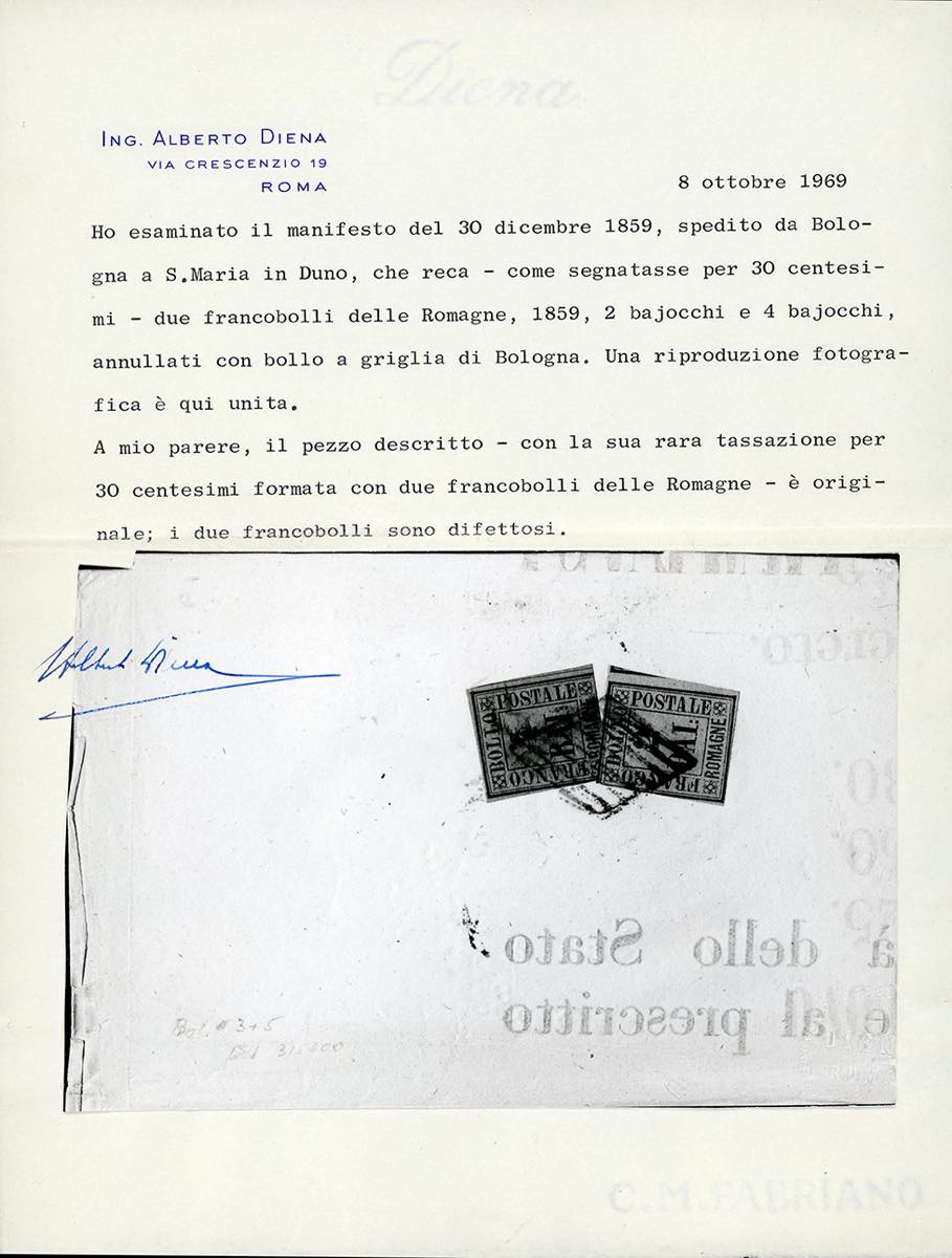 1859 - 2 baj giallo arancio, 4 baj fulvo (3,5), margini da ampi a leggermente intaccati, al verso di fresco manifesto in porto assegnato, a firma del Governatore Farini, datato Modena 30/11/1859, da Bologna a S.Maria in Duno, sul fronte tassa di 30 centesimi. Affrancatura rarissima e non catalogata per assolvere la tassa di 6 baj (pari a 30 centesimi) per il porto multiplo. Cert. A.Diena, Ferrario.