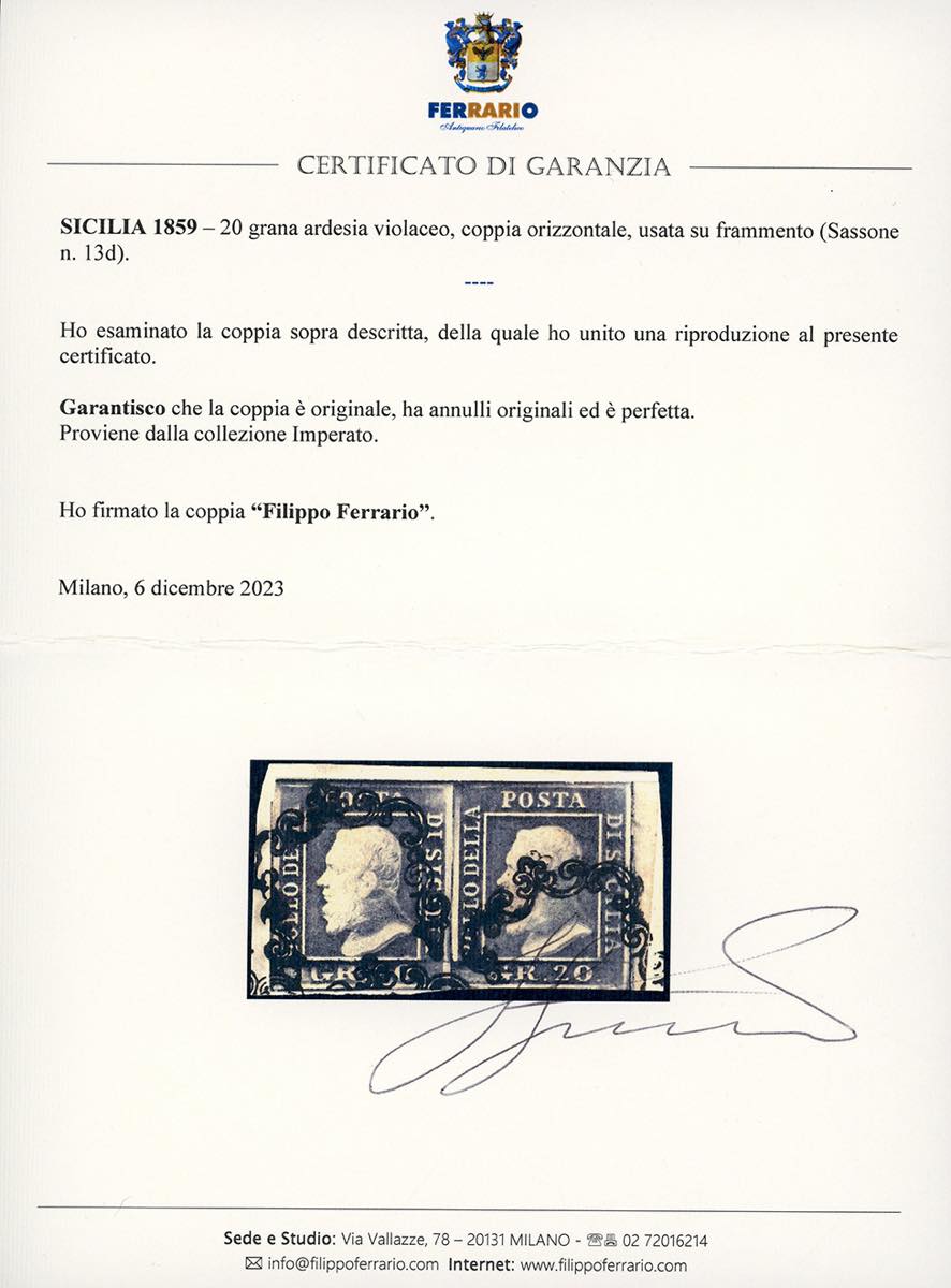 1859 - 20 grana ardesia violaceo (13d), coppia perfetta, bordo di foglio, usata su frammento. Molto bella. Chiavarello, cert. Ferrario. Ex coll. Imperato.