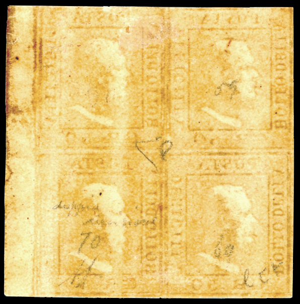 1859 - 50 grana lacca bruno (14), blocco di quattro,pos. 59-60, 69-70, bordo di foglio, testa d'avorio al verso, gomma originale, perfetto e di ottima qualità. A. ed E.Diena, cert. Finanziario Bolaffi 70%-110%.