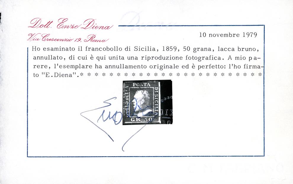 1859 - 50 grana lacca bruno (14), testa d'avorio al verso, usato, perfetto. Molto bello. Fiecchi. Ferrario, cert. E.Diena e Colla.