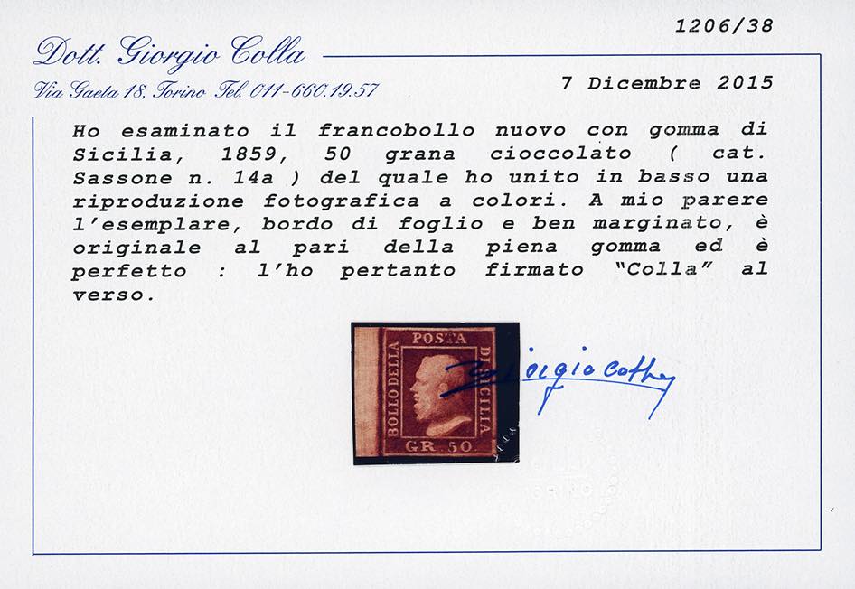 1859 - 50 grana cioccolato (14a), bordo di foglio a sinistra, gomma originale, perfetto. Splendido e molto fresco. Emilio Diena, G.Oliva, Ferrario, cert. Colla.