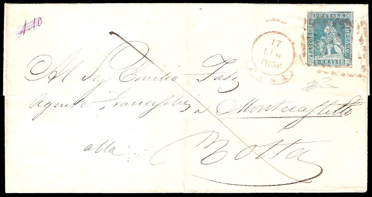 PISA, muto a rombi rosso punti R1 - 2 crazie (5e), perfetto, su sovracoperta di lettera del 17/7/1856 per Montecastello. Rara. Cert. Ferrario.