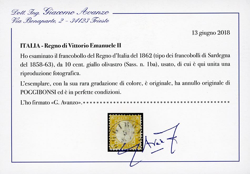 1862 - 10 cent. giallo olivastro (1ba), perfetto, usato a Poggibonsi. Il più raro colore allo stato di usato per questo francobollo. ... Read more