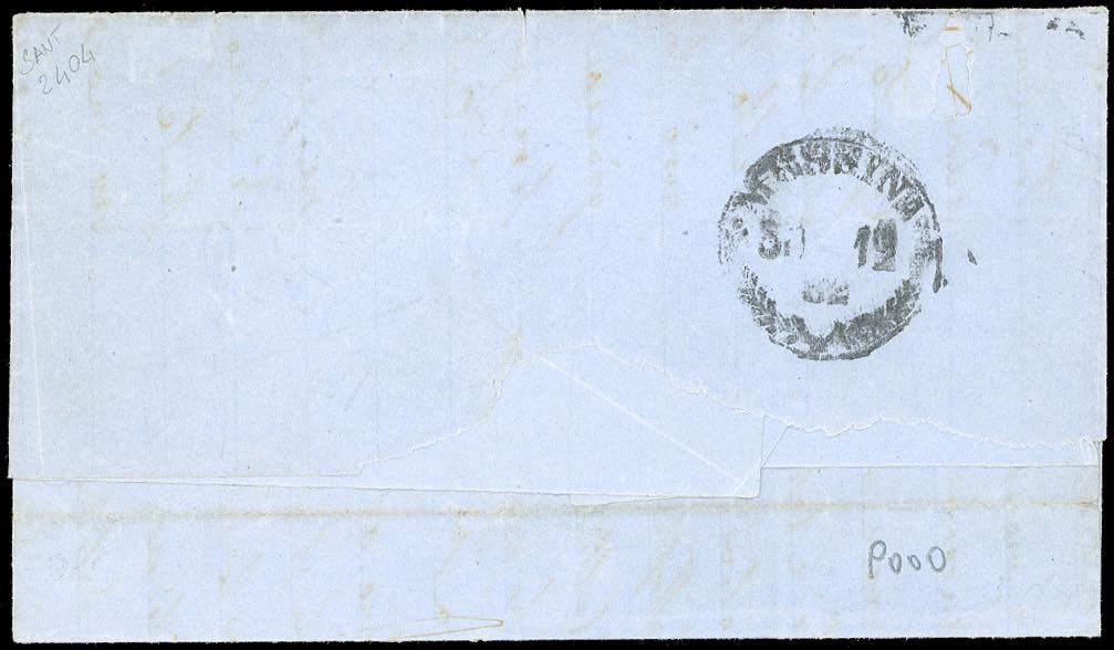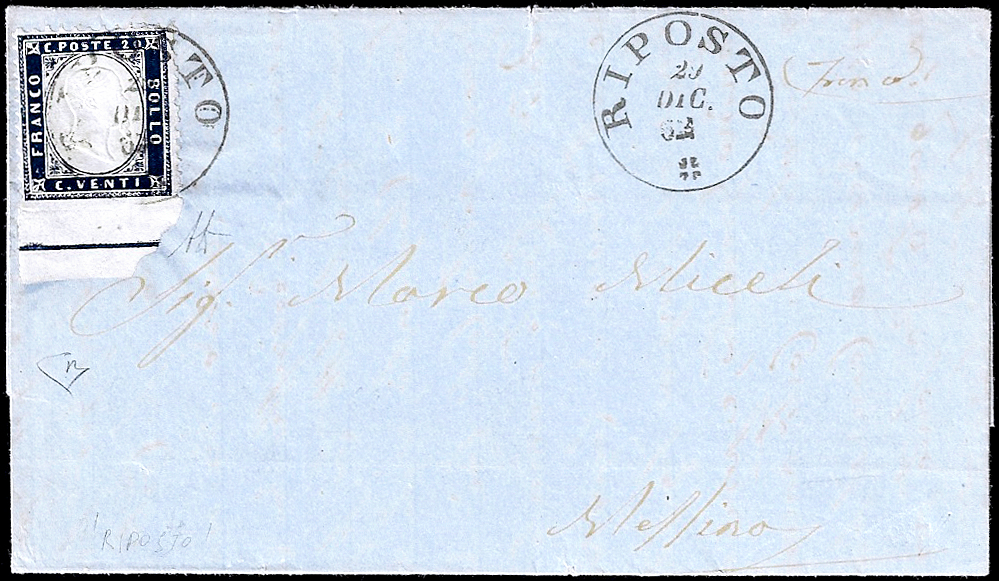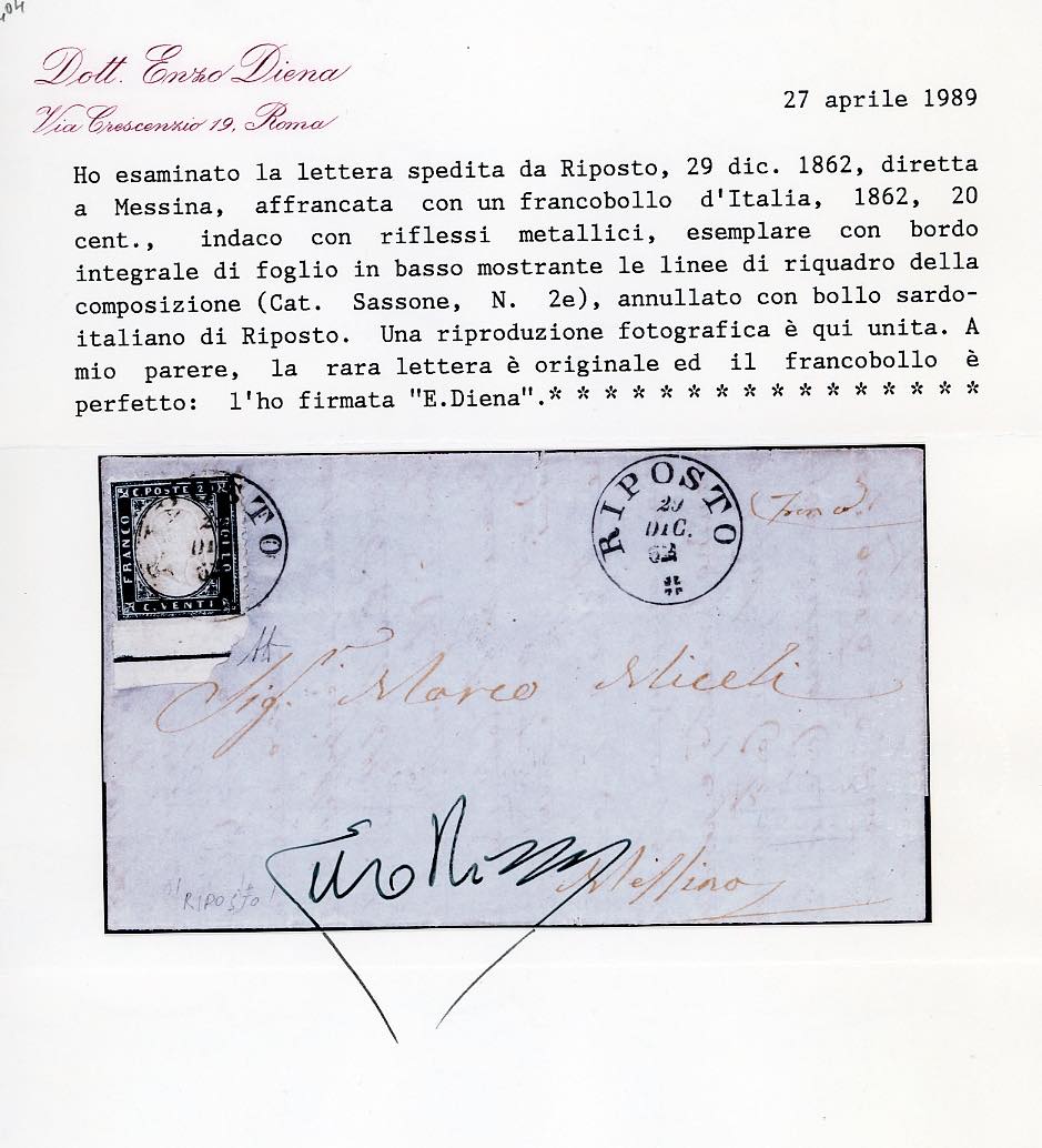 1862 - 20 cent. indaco, non dentellato in basso con bordo integrale e linea di riquadro (2l), su lettera da Riposto 29/12/1862 a Messina. A.Diena, cert. E.Diena.
