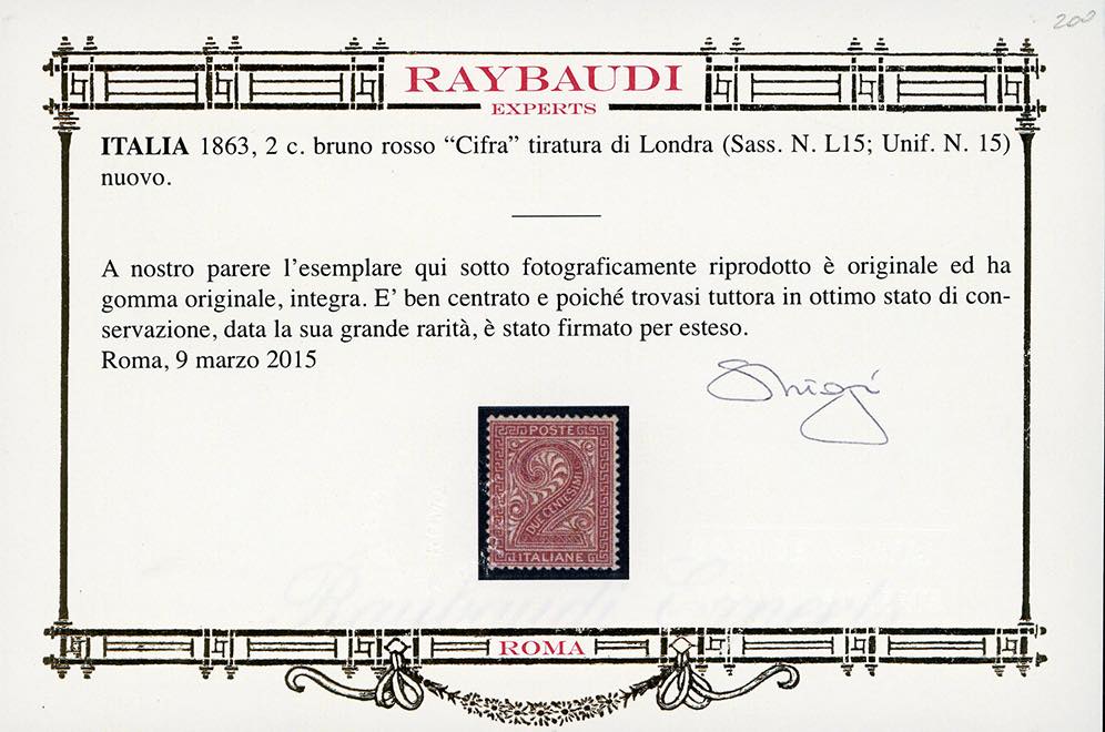 1863 - 2 cent. bruno rosso De La Rue, tiratura di Londra (L15), buona centratura, nuovo, gomma originale integra, perfetto. Fiecchi, cert. Oro Raybaudi.