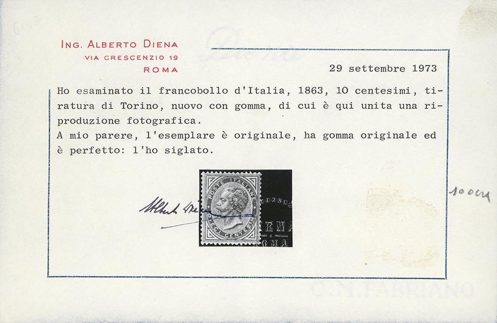 1866 - 10 cent. ocra giallo, De La Rue, tiratura di Torino (T17), buona centratura, nuovo, gomma originale, leggera traccia di linguella, perfetto. Molto fresco. G.Oliva, cert. A. ed E.Diena.