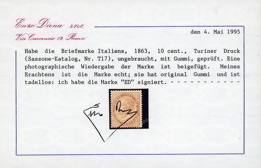 1866 - 10 cent. ocra giallo, De La Rue, tiratura di Torino (T17), nuovo, gomma originale, leggerissima traccia di linguella, perfetto. A.Diena, cert. Diena.
