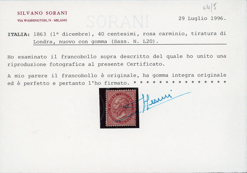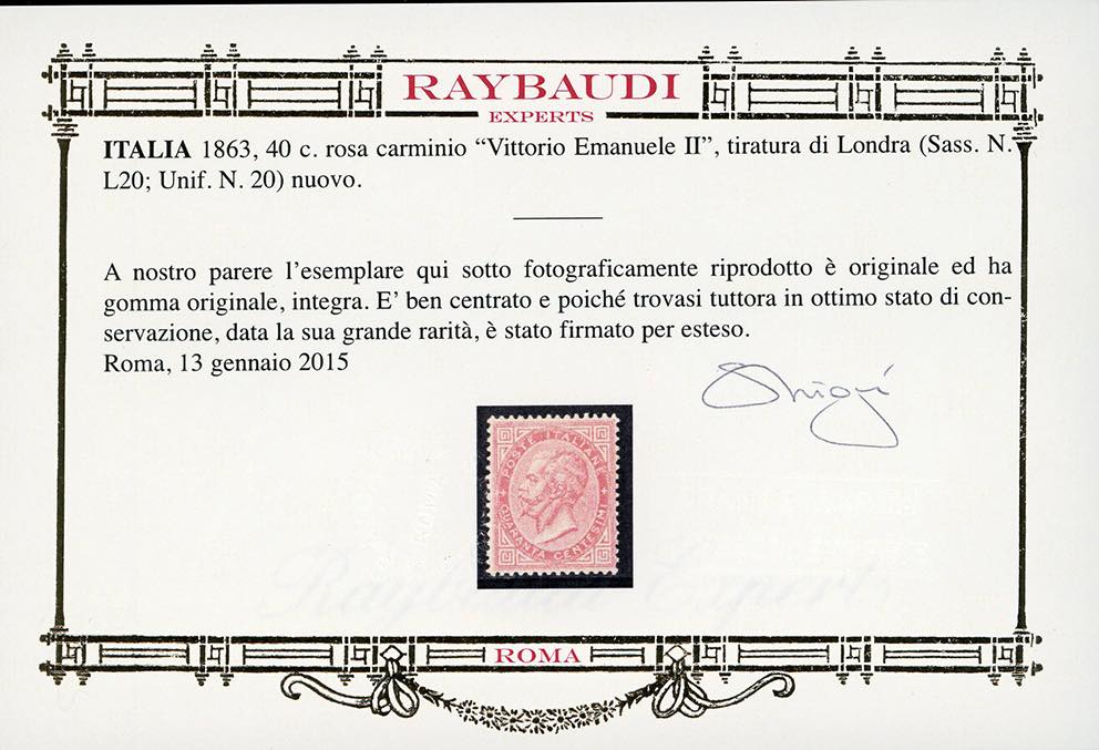 1863 - 40 cent. rosa carminio, De La Rue, tiratura di Londra (L20), ben centrato, nuovo, gomma originale integra, perfetto. Raro e di ottima qualità. A.Diena, cert. Oro Raybaudi e Sorani.