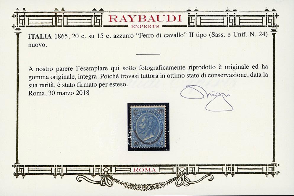 1865 - 20 cent. su 15 cent. Ferro di cavallo, II tipo (24), discreta centratura, nuovo, gomma originale integra, perfetto. E.Diena, Fiecchi, Caffaz, cert. Oro Raybaudi.