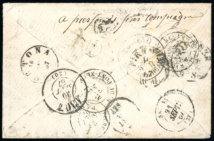 1867 - 20 cent. celeste chiaro, tiratura di Londra (L26), perfetto, su busta inizialmente indirizzata a Cortona, poi rispedita a Firenze, dove l'affrancatura venne integrata con un altro analogo esemplare da 20 cent. per essere nuovamente rispedita in Francia più volte, come testimoniano i numerosi bolli di transito al verso. Affascinante rispedizione multipla in periodo di Firenze Capitale. Ferrario.