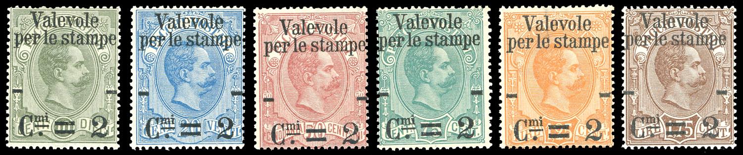 1890 - Soprastampati Valevole per le stampe, serie completa (50/55), nuovi, gomma originale integra, perfetti e molto freschi. Ferrario.