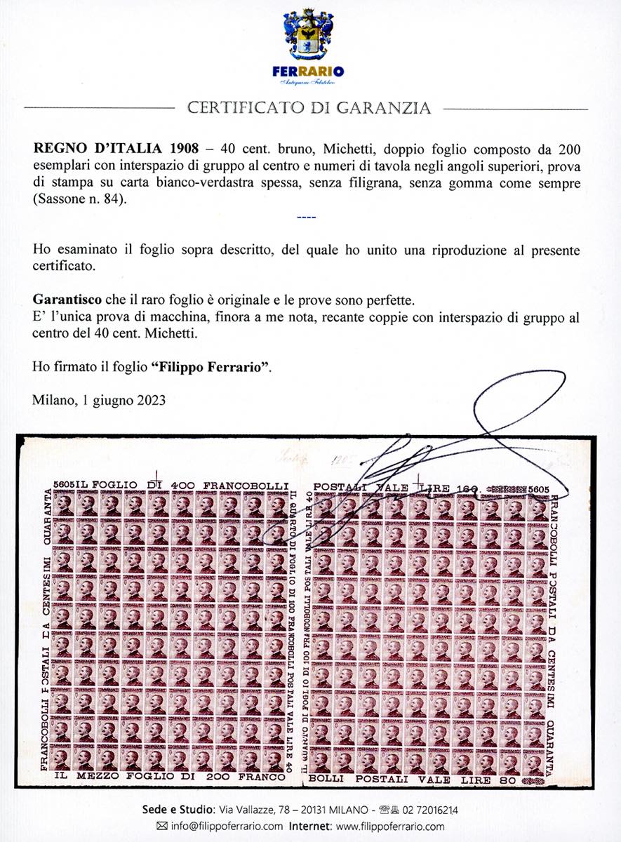 1908 - 40 cent. bruno, Michetti (84), prova di stampa su carta bianca- verdastra spessa, senza filigrana, senza gomma come sempre. Eccezionale doppio foglio composto da 200 esemplari con interspazio di gruppo al centro e numeri di tavola negli angoli superiori, perfetto. Insieme straordinario ed unico. Di tale prova di macchina finora si conoscevano solo pochi esemplari e nessuno era finora noto recante coppia con interspazio di gruppo al centro. Grande rarità. Cert. Ferrario (i cataloghi CEI e Sassone catalogano prove simili circa 50.000/60.000 €).