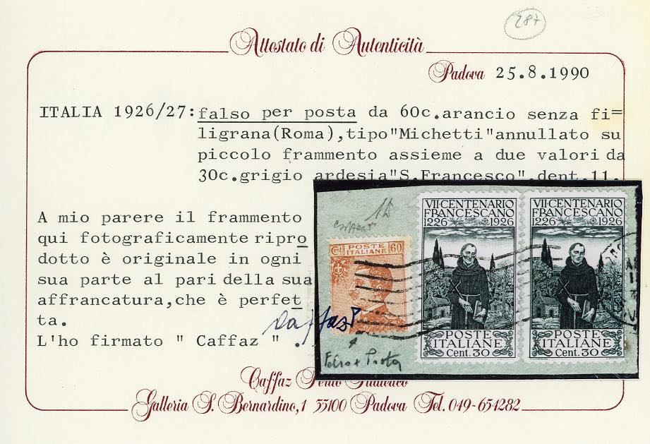 1927 - 60 cent. Michetti, falso per posta di Roma, 30 cent. S.Francesco, dent. 11 (F205,198), perfetti, usati su frammento. Uso molto raro, si conoscono solo due esemplari usati su frammento e due su busta di questo falso. A.Diena, Ferrario. cert. Caffaz.