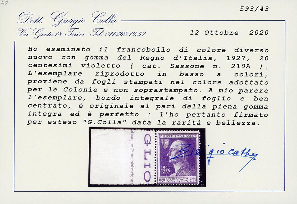 1927 - 20 cent. Volta violetto, errore di colore (210A), bordo di foglio, nuovo, gomma originale integra, perfetto. Molto fresco, ottima qualità. Cert. Colla.