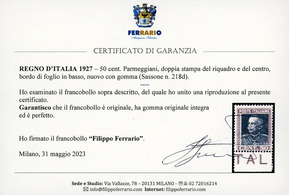 1927 - 50 cent. Parmeggiani, doppia stampa del riquadro e del centro (218d), bordo di foglio in basso, gomma originale integra, perfetto. ... Read more