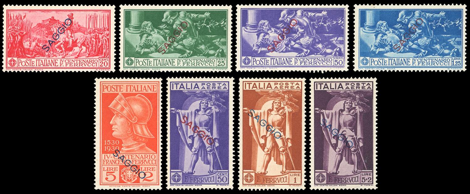 1930 - Ferrucci, serie completa (276/280+A), tutti soprastampati "saggio", gomma originale integra, perfetti. Raro insieme.