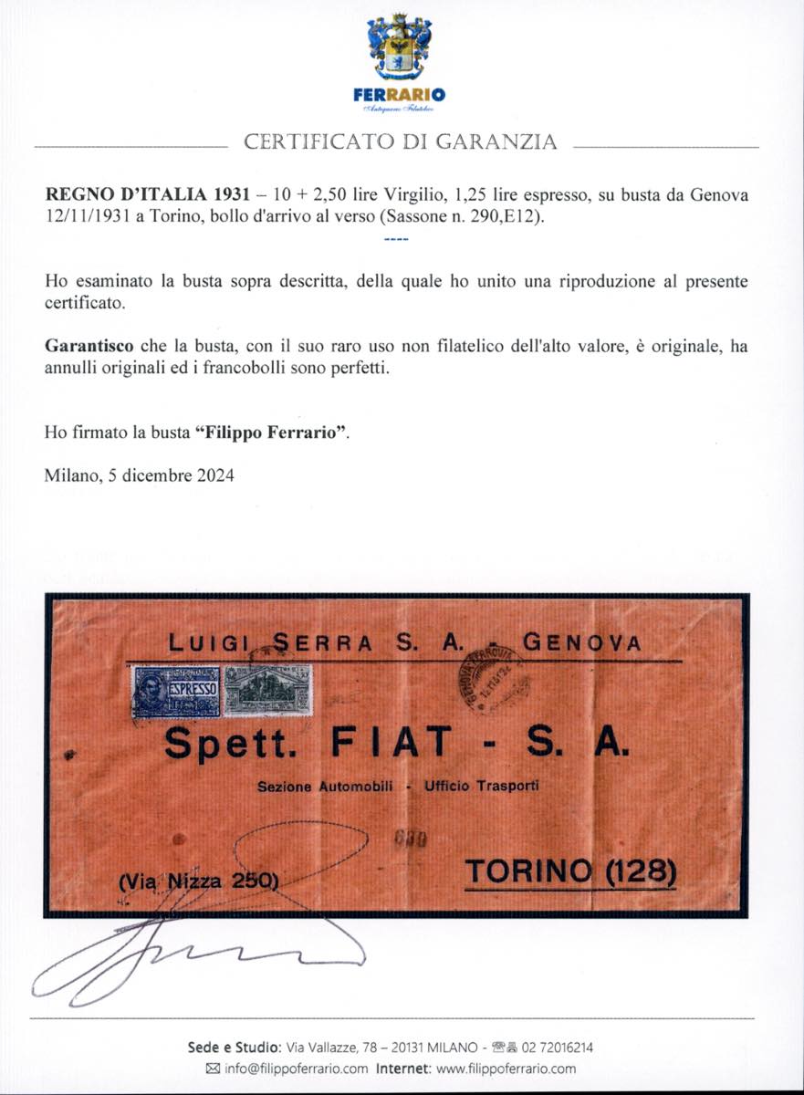 1931 - 10 + 2,50 lire Virgilio, 1,25 lire espresso (290,E12), perfetti, su busta da Genova 12/11/1931 a Torino, bollo d'arrivo al verso. Raro uso non filatelico dell'alto valore. A.Diena, cert. Ferrario.