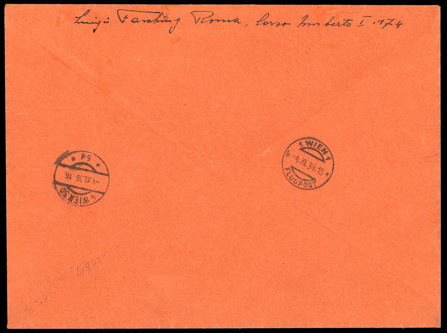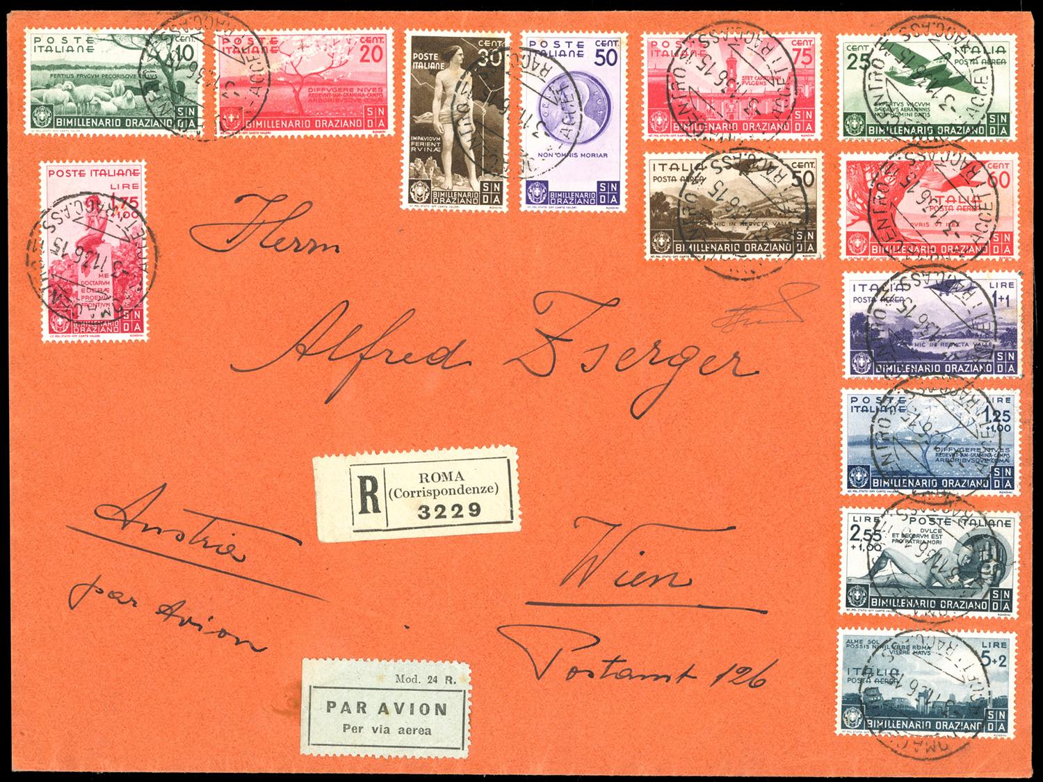 1936 - Orazio, serie completa (398/405+A95/A99), perfetti, su aerogramma raccomandato da Roma 3/11/1936 per Vienna, bollo d'arrivo. Cert. ... Read more