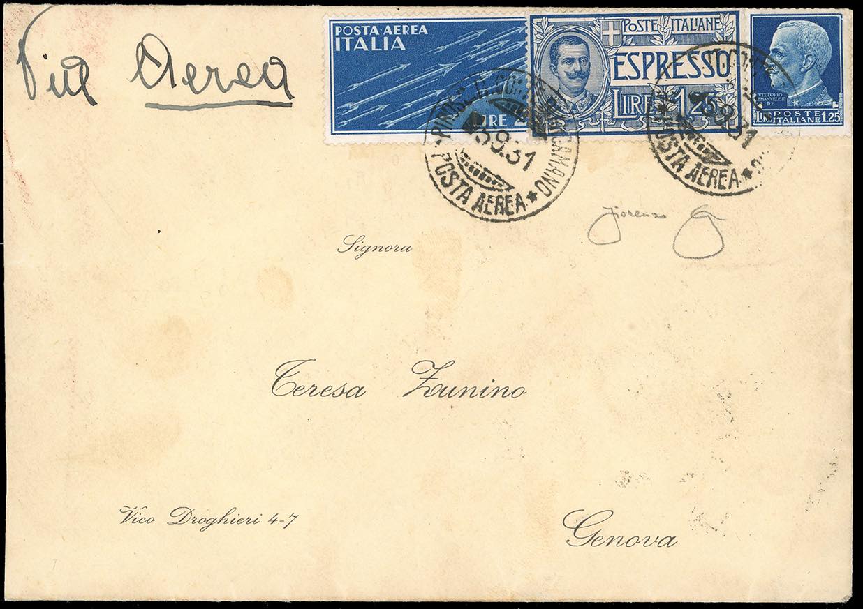 1931 - 2 lire posta aerea, 1,25 Imperiale, 1,25 espresso (A15,253,E12), lievi difetti, su aerogramma dal piroscafo Conte Biancamano 5/9/1931 a Genova, trasportato via aerea Sana Gibilterra-Genova. Unico noto. Longhi.