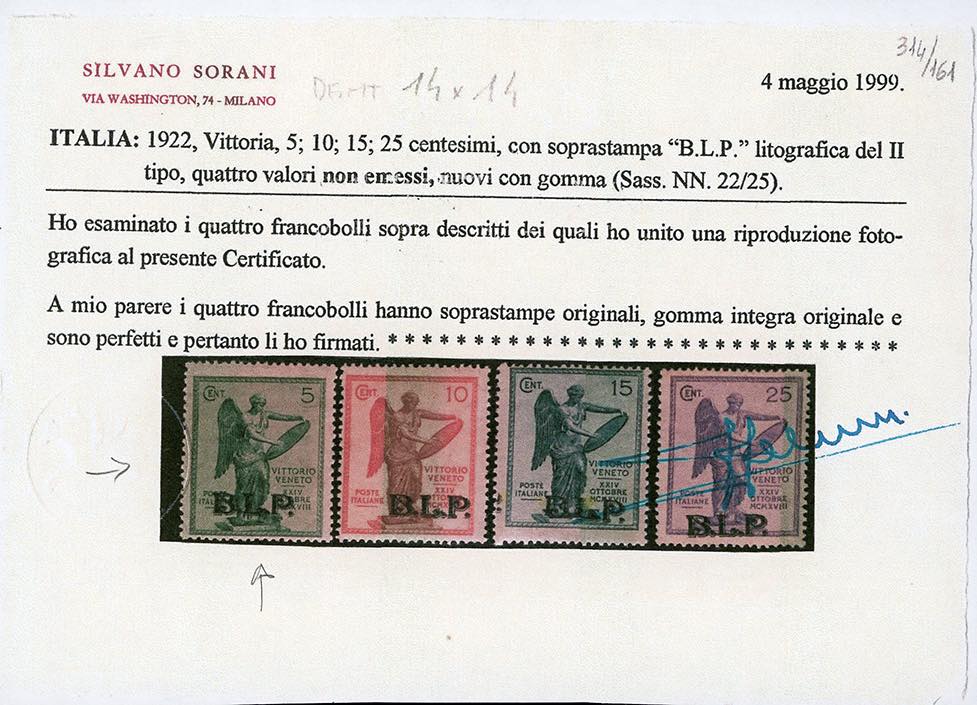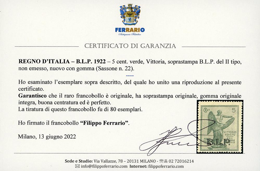 1922 - 5 cent. Vittoria, soprastampa BLP del II tipo, non emesso (22), nuovo, gomma originale integra, perfetto. Raro, tiratura 80 esemplari e centratura sopra la media. Cert. Ferrario, fotocopia cert. Sorani della serie.