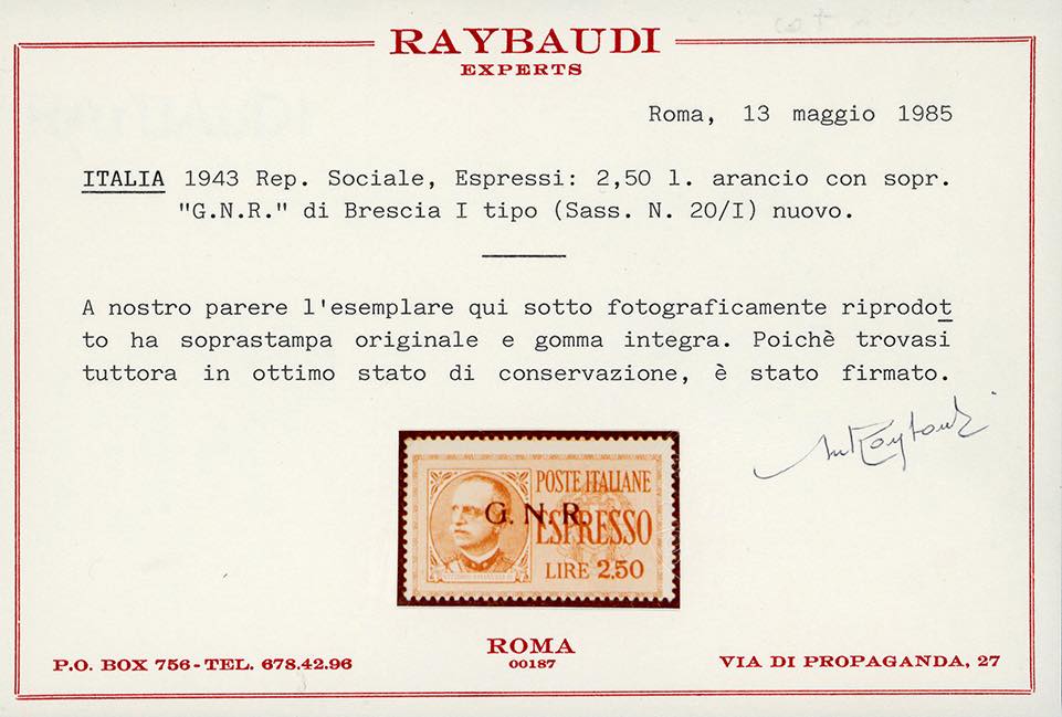 1943 - 2,50 lire, soprastampa G.N.R. di Brescia, I tipo (20/I), nuovo, gomma originale integra, perfetto. Molto raro, tiratura 100 ... Read more
