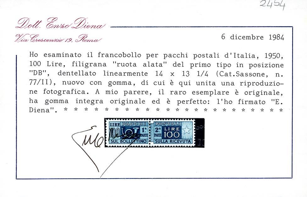 1950 - 100 lire dent. 14 x 13 1/4, filigrana ruota del I tipo, posizione DB (Sass.spec. 26DB), gomma originale integra, perfetto. Molto raro. Cert. E.Diena.